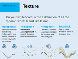 For example, the texture of the music might be thick or thin, or it may have many or few layers. Texture is one of the basic elements of music. About press copyright contact us creators advertise developers terms privacy policy & safety how youtube works test new features press copyright contact us creators. When you describe the texture of a piece of music, you are describing how much is going on in the music at any given moment. It consists of one melody, or tune, played or sung by a single person, or in unison.