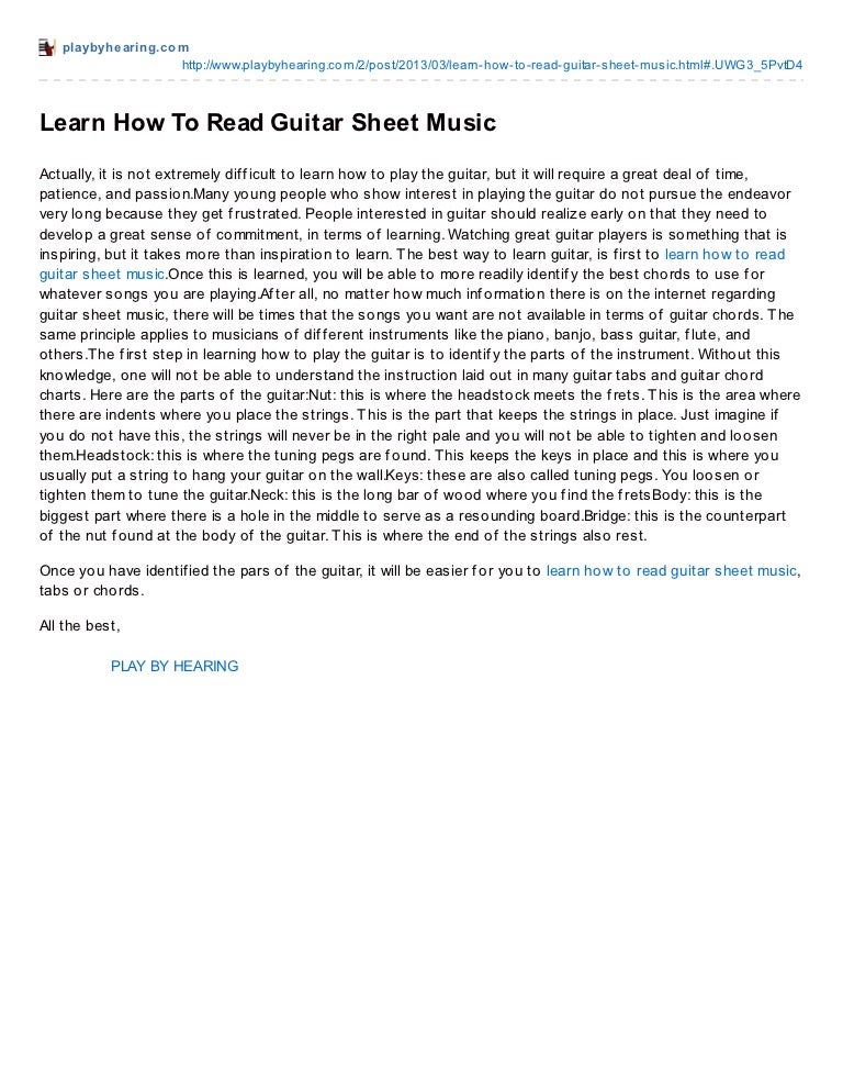 "But it's cheating!" - The musical way to read music ... from blog.musicteachershelper.com After you have a good grasp of how to read guitar sheet music, you're ready to learn how to play guitar chords and rhythms as well as learn to read chord charts and guitar tabs. How to read sheet music step 1: Because being able to read standard notation kicks ass, that's why. Guitar tablature, or tab, is a shorthand way of reading and writing music. Or to practice reading music, go to sheet music or beginner lessons. All music contains these fundamental components, and to learn how to read music, you must first familiarize yourself with these basics. I'll also go into some more detail about the most important ones. Reading notation will force you to think about rhythm, dynamics, ornamentation, space, vibrato, and tempo more than ever before.